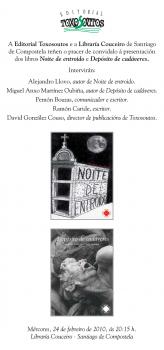 Alefandro Llovo e Miguel Anxo Martínez Oubiña presentan os seus libros de relatos Noite de entroido e Depósito de cadáveres acompañados de Pemón Bouzas e Ramón Caride. O acto terá lugar na libraría Couceiro hoxe ás 20,15h.